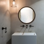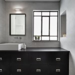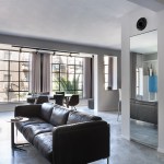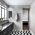 The bathroom in the master suite features tiles made of two types of marble arranged in a FISH-BONE pattern in black and white, while the walls are designed with gray concrete finishes. The additional bathroom walls were also designed with concrete finishes, exuding an urban and clean look.