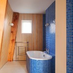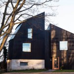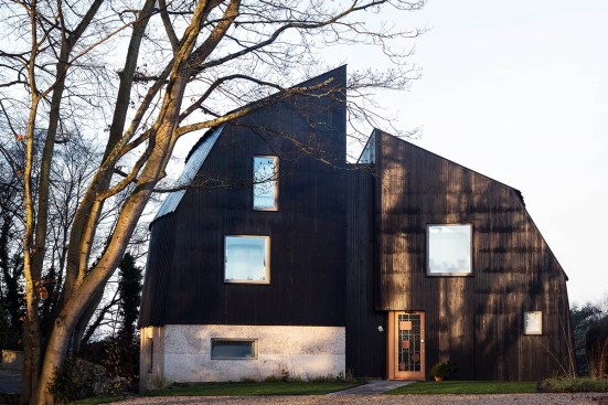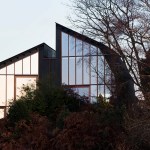 The Houseboat is tar-black, sitting on a weathered sea wall. The solid base is made from roughcast concrete, and contains the bedrooms, tightly packed as in the hold of a ship. The master bedroom sits on the entrance level, with further rooms a half-level down. The hallway looks up to the light, and to the three-storey arch of concrete that holds up the house. Ascending from below the Plimsoll line, the living and dining areas are lofty and open, with a feeling of being ‘on deck’. Portal frames in Douglas fir support curved walls, so that the rooms widen as they rise up, and then narrow in to the western view. Inside it’s all taut curves and timber joinery, a mixture of rawness and finish. The truncated ends form tall elevations, closed at the front and open in a dramatic screen to the rear, with the weather for the fourth wall.