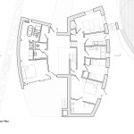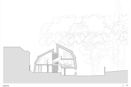 The site for The Houseboat has the same opportunity, but in reverse: if one gets up to the first floor, there are wonderful views over the heathland and to the bay beyond. Nestled within the pines, and with a long narrow approach, the site suggests a verticality, a reaching upwards. The house is designed as two hulls, upturned for shelter and sat upon a solid base. One side sits up higher, following the staggered section, but also negotiating the change of scale from the residential street to the high pine trees to the south. The form of the house, with its double-curve on plan, is designed to allow the volume within this context, and to shy away from the established street pattern and recede into the arc of the trees. It sits at the end of the suburban road, but connects strongly to wild heathland beyond.