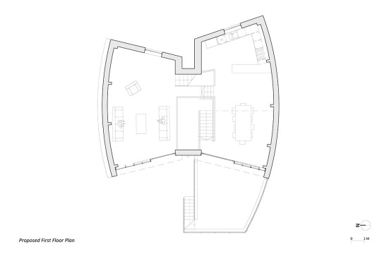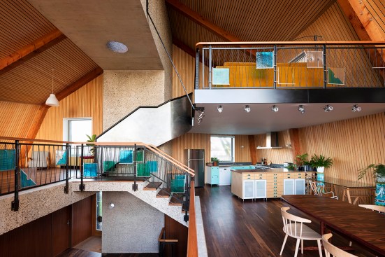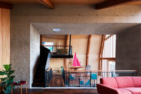 The Houseboat is upside down, its main room raised up to the view. It’s also curved in plan, and split in two, one side raised above the other. It’s an odd fish of a house.