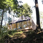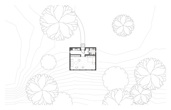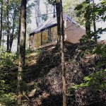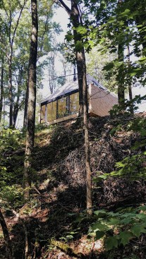 Set above the ground on concrete piers, and on the edge of a steep slope, the 600-square-foot cabin operates entirely off the grid. The living room and bedroom are a single space centered on a wood burning stove located in front of a 25-foot-wide wall of floor-to-ceiling windows overlooking the surrounding forest and a lake.