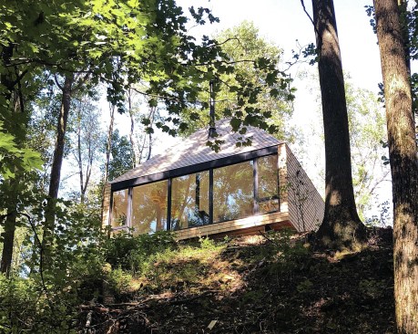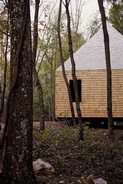 The Hut presents a very singular image of domesticity, with its almost-square plan topped by a hipped roof. Looking from many vantages like a treehouse, its exterior is entirely clad in cedar shingle and shakes, with a monochromatic interior of white-painted wood lap paneling. Designed in the Columbus, Ohio, office of Midland Architecture, the Hut’s secluded site in eastern Ohio was formerly a strip mine. The clients—Midland partner Greg Dutton, along with his father and brother—built the structure with relatives and friends as a retreat on the Belmont County property that’s been in the family for almost four decades.