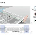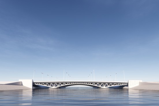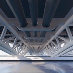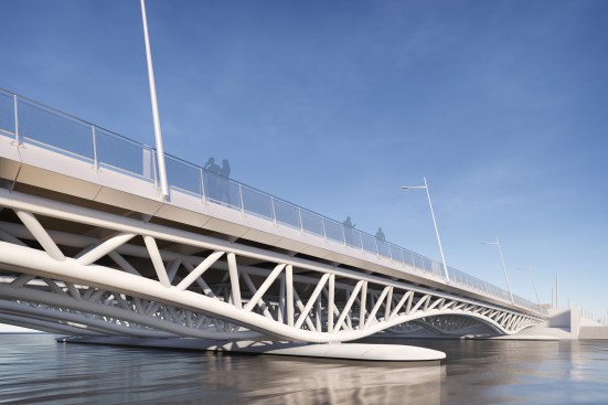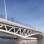 Spanning 60m and 90m, the bridges’ continuous undulating steel trusses build on the theme of stones skipping over the water. Voids between the central decks for the public tram and the combined vehicle, pedestrian and cycle routes on either side allow views of the water and let light through to the area below the bridge decks.