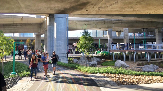 Situated below I-93 in Boston is Infra-Space 1, an 8-acre pilot demonstration that boasts a waterfront promenade along with recreation and event spaces. Historically an industrial zone, the neighborhood was deeply underserved by parks and open space, and the space below the viaduct was afflicted by crime and pedestrian traffic fatalities. Now Infra-Space 1 serves as a model for another eight sites, all of which are in the design concept phase. The pilot’s financial model includes commercial parking to generate revenue, but it did not add any net new parking spots to the area.
