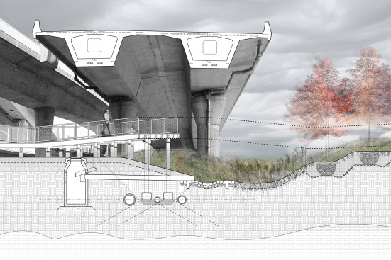 By using a careful soil cutting and filling strategy, the team was able to establish a responsible model for dealing with contaminated soil at Infra-Space 1. The resulting undulating landscape allows for stormwater management in the low-lying areas and groves of trees on along the higher hills. The drain leaders that connected the viaduct to subterranean drainage pipes were rerouted into the landscape and filled with plantings hearty enough to withstand high levels of salts and minerals. Other strategies such as stone dissipation basins reduce the velocity of the water cascading down from the highway—often as high as 70 feet above ground—and trap solid waste for proper disposal. The filtration landscape at Infra-Space 1 alone diverts 3.5 million gallons of contaminated water from making its way into the Atlantic Ocean.