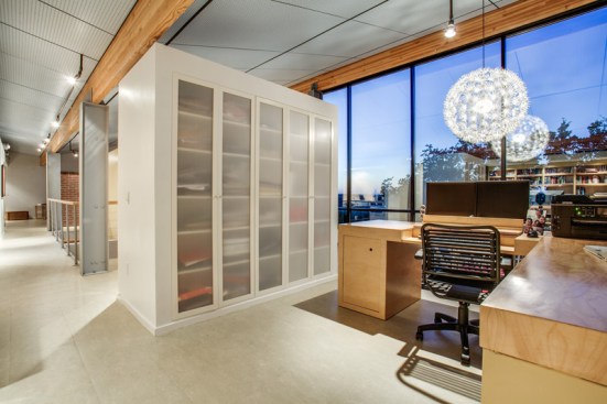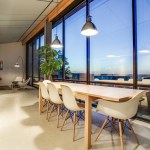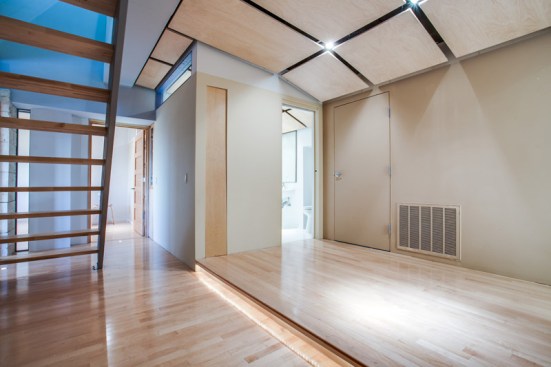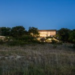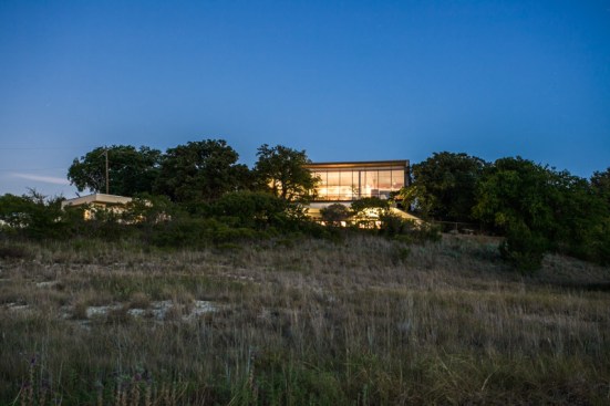 This 3000-square-foot home is partially build into the hillside. First floor is constructed of all concrete as thermal barrier. Second floor is glass and steel and has a double skin outer facade finished with cork. The inverted "v" shape roof catches both rain water run off and also incorporates a roof sprinkler system that cools the house during the hot Texas summer months
