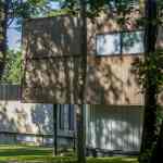 To reflect the natural surroundings of the trees and skyline large panes of glass were used. Pebble dashing, sourced from a local beach, was used on the lower walls to give the house a more natural look and feel. Black stacked-paper cladding was also used to create a shadow-effect around the build. Finally, Kebony wood was used in order to further emphasize the natural and organic aspects of the design. For this particular project, Kebony beams of maple and pine wood are cooked with alcohol and pressure, turning their soft wood properties into a hard wood. The result is a beautiful and maintenance-free finish. Overall, the innovative cladding breaks up the house against the natural setting.