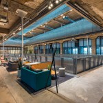A total of four columns in the middle of the building were demolished to add an angled, full height lightwell. The lightwell cut an angled slice out of the building following the path of reflected light from the skylight above. The remaining slab at each level was hung from the new steel framing over the existing roof level by means of three-inch diameter stainless steel hanger rods. The hung solution was used to conceal bulky structural transfer elements while exposing lighter, more architecturally sculpted elements within the occupied space.