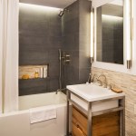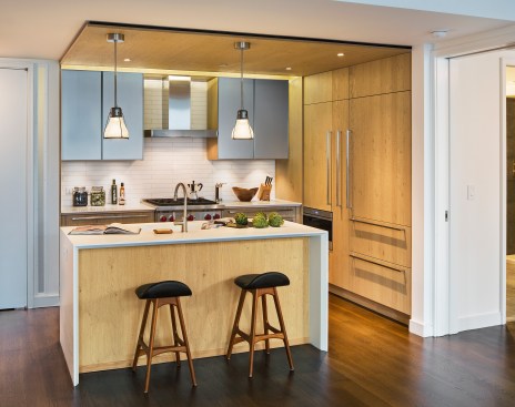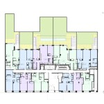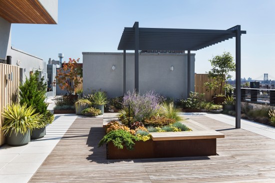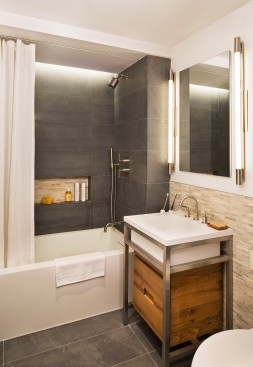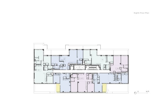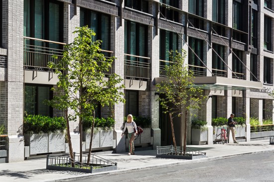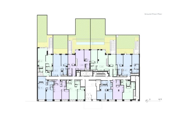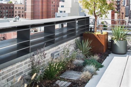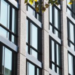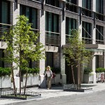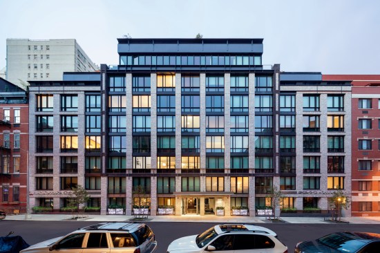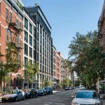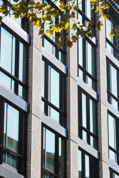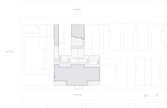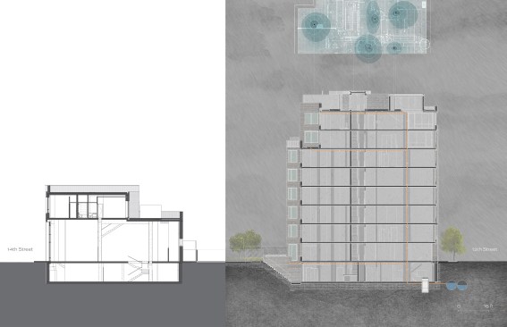 The Jefferson is a new multi-family building that demonstrates a neighborly approach to development in NYC’s East Village. This project is a successful model of an “urban steward project” as a result of responsible civic and environmental design. Formerly the site of the Jefferson Theater, a vaudeville theater that was demolished in 2000, this 115,000 square foot project is densely packed with 83 market-rate units ranging from studios to 3-bedroom penthouses. In addition to its 157’ wide facade on 13th Street, the development also fronts 14th Street with two low-scale commercial buildings. The design instills a strong sense of sustainability and stewardship with its residents. To create a building that would be a ‘supporting player’ to life on this block, the team closely studied the neighborhood’s scale, current ecological trends, and the expectations that come with contemporary New York living. For years after the theater’s demise, this block of 13th Street was challenged by the large and empty lot extending through to 14th Street where the main entrance had been. Now, a continuous street wall has been re-established and cornice lines re-enforced. The façade’s light mottled silvery brick bolsters a prevalence of white and red masonry in the neighborhood and establishes a shared visual language between the project’s two northern-facing commercial facilities on 14th Street with the residential building on 13th Street. Echoing the site’s former theatrical presence, this building’s center extends slightly out and above the rest of the block, creating a proscenium with a “play” of brick piers and varied window patterns within a painted steel frame. These thoughtful gestures result in The Jefferson complementing the area’s 19th century architectural vernacular while simultaneously offering a bold example of modern craft. This careful attention to detail extends to the interior. Each unit features custom-designed kitchen and bathrooms. Warm oak paneling on the walls and ceiling both disguises modern appliances and defines the volume of the kitchen. In the bathroom, vanities are composed of reclaimed barn wood set within a steel satin-nickel finished frame supporting a white Corian sink. All building materials were vetted by the team for aesthetic value, durability, cost, and multi-faceted impacts on both human and environmental health. Occupancy wellness is enriched by ample opportunities to connect with the natural environment from indoors. The project was awarded LEED points for “exemplary” performance for views – ensuring that residents are able to view greenery, the urban skyline and blue sky. Indoor air quality is enhanced by building materials vetted for aesthetic value, durability, cost, and multi-faceted impacts on both human and environmental health. The Jefferson also boasts ample outdoor space. Residents of the 7th and 8th floors benefit from terraces bordered by green roof planters, 2nd floor apartments feature Juliet balconies, and five ground floor apartments offer substantial backyards – a unique draw in a city with few ground floor residences in new developments. The building received LEED Gold certification in part due to stormwater credits, a rare accomplishment in an urban setting. This was made possible through the implementation the blue roof that can detain water for up to 24hours to help reduce overflow in the city’s drainage system (think rooftop bathtub); and a centrifugal action sediment separator that filters stormwater before it enters the municipal sewer system. The blue roof, which includes native plants and low-lying green roofs, is part of the 1,853 sf roof garden that is accessible to all building tenants. Other key sustainable qualities of the LEED Gold certified project include 72 bicycle spaces, a streamlined eight-sort recycling system, and high performance windows. The use of regional materials, the reduction of construction waste, and green power diversion all further contribute to the building operating as an urban steward. Notably, the team took the project from conception to completion in under three years, while maximizing the three-building site’s residential possibilities within allowable zoning restrictions.