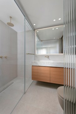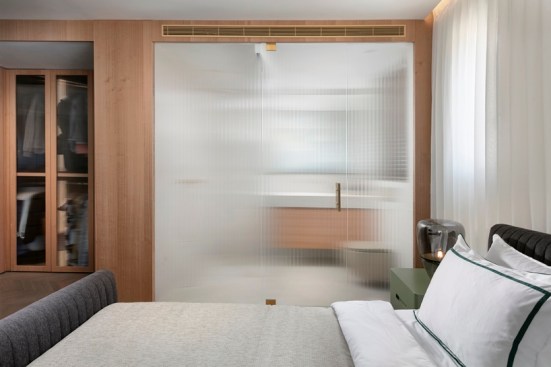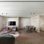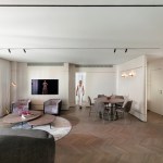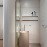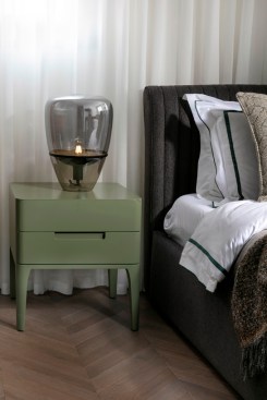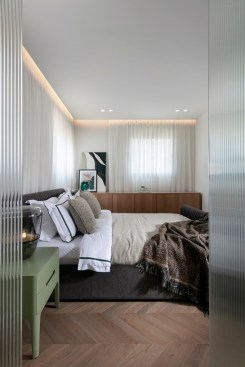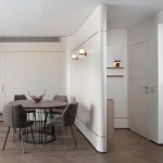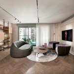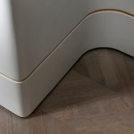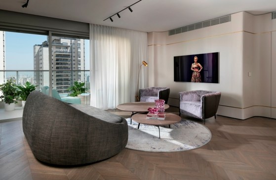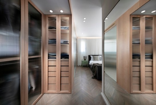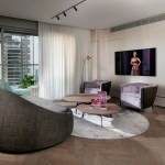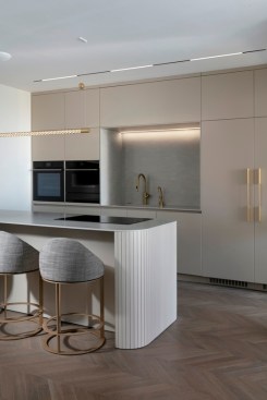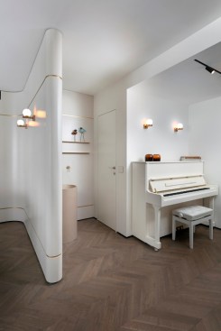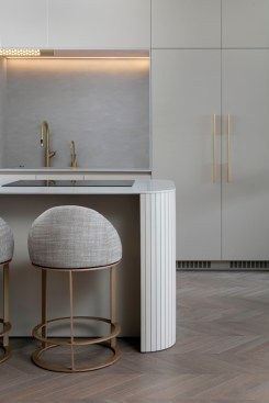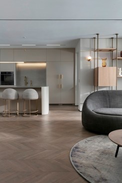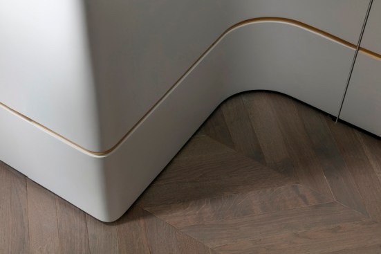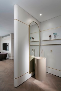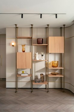With an eye for detail, “The Jewelry Box” boasts expert carpentry, round edges, and brass accents, adding an understated touch of sophistication. Every piece of furniture was customized to harmonize with the apartment’s curved aesthetics.