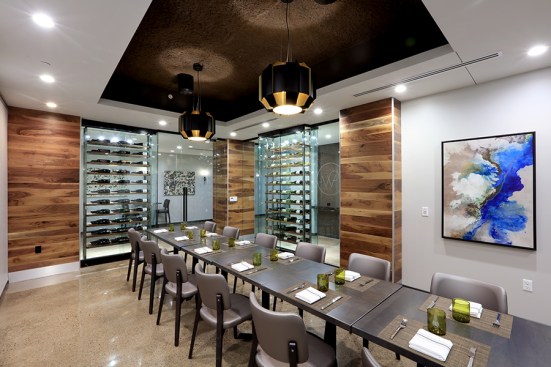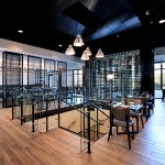 The program included a dual-level riverfront terrace with seating for 80 guests, a new riverfront facade, a wine tasting room, new bar, and a staircase that connects to a downstairs private dining area. With an aggressive schedule of only nine months, we were tasked with completely transforming the space, and bringing a new global concept from Wolfgang Puck to life, while minimizing the impact to hotel guests. The new stair and custom wine case grab guests’ attention, while an open kitchen and airy interior – incorporating materials such as wood, glass, and tile – create a relaxed and inviting setting.