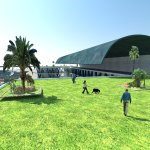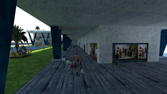 CENTRO COMMERCIALE: La struttura si eleva su tre livelli fuori terra: i primi due sono destinati all’ area commerciale , mentre il terzo è caratterizzato in parte dalla copertura a "tetto giardino" sulle due ali laterali, collegate fra loro tramite un corridoio all’aperto, sopra il quale è situata la struttura in vetro a forma di onda. All’interno di essa scorre dell’acqua a cascata dentro una fontana a raso terra situata nel giardino a piano terra. La parte di copertura esposta verso SUD (quella oltre la quale ha inizio la copertura in vetro), è rivestita da pannelli fotovoltaici. I primi due livelli sono caratterizzati da ampi portici, sorretti da pilastri in acciaio a forma di Y, di colore blu, che si pongono in evidenza cromatica rispetto allo sfondo di colore bianco (sfumato) del centro commerciale. Prevale per tutta la struttura, il contrasto "chiaro/scuro" tra la pavimentazione e il colore degli intonaci.