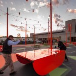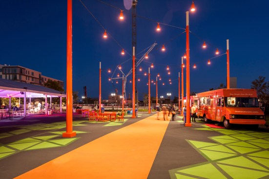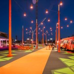 The Massachusetts Convention Center Authority (MCCA) is gearing up for a major expansion of the Boston Convention & Exhibition Center (BCEC), beginning in 2016. This expansion – which will allow Boston to compete for top tier conventions – will require additional hotel rooms, parking garages, supporting retail, and, critically, a vision and identity for D Street. D Street was – until the construction of the Lawn on D this past summer – a bleak and under-used landscape composed mostly of vacant lots, aged industrial buildings, and surface parking. An urban design team was brought on board by the MCCA to help shape a vision for D Street and its upcoming development. In collaboration with representatives from the surrounding community, the design team and the MCCA conceived of the Lawn on D – a flexible, vibrant, and temporary open space that would be an “early arrival” on D Street, setting the tone for civic impact and expressing the ambitions of the new district. Months later, the design team was re-commissioned as landscape architect of the Lawn on D. This new district occupies a critical mid-point between South Boston, the Innovation District and Liberty Wharf, and the Fort Point and Channel Center neighborhoods. This new district aspires to be interactive, flexible, technologically advanced, inspired by art and events, and inclusive of many constituents (residents, workers, conventioneers, tourists). The Lawn on D demonstrates and pilots these ambitions.