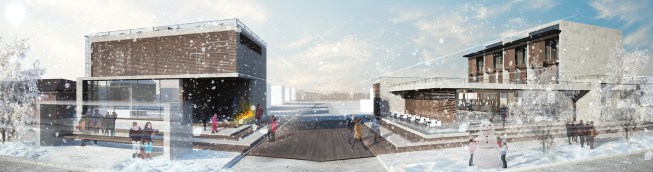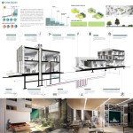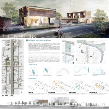 Revitalization of the community, that is characterized by a high diversity, was one of the major goals of the project. Following the concept of encouraging social interaction, the program of public space, that will bring the unification to the community, was chosen. Thus, the programs of the buildings promote the interaction in the community. The school located nearby makes the community center (which includes library) a perfect place for children’s education. Also, bicycle parking lot was designed in front of the restaurant in order to encourage the eco-friendly transportation alternatives.