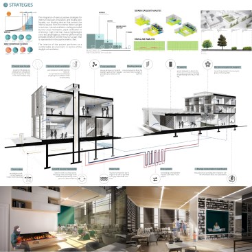 The interior of the project performs as a comfortable environment in terms of the daylight and ventilation. Firstly, for providing sufficient sunlight in the rooms south facing glazed areas were designed. Sefaira analysis shows that satisfying level of daylight is provided in the both buildings; underlit and overlit areas were mitigated through the design process by enlarging the window areas and adding shading devices. Secondly, for providing natural ventilation, window openings were placed at north and south facades of the buildings, which resulted in the airflow going on the different floors of the building. In addition, stack ventilation in the community center allows to get rid of the hot air in the space, providing comfortable conditions inside of the building.