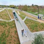 The new building for the Los Angeles Museum of the Holocaust by local firm Belzberg Architects is located within L.A.’s Pan Pacific Park, the site of the existing Los Angeles Holocaust Monument. The 32,000-square-foot, LEED Gold museum was designed as an educational institution, which anticipates 40,000 students each year. Much of the building is submerged to integrate it quietly into the park setting, with the landscape extending over the roof. “I think there’s an interesting concept here,” juror Joe Valerio said. “You descend into the earth, into the darkness of the Holocaust, and then you come back from that experience, which is poetic.” A supple shotcrete wall traces the museum’s footprint and announces its presence while minimally disrupting the park’s landscape. Existing park pathways are used as connective elements to integrate the site’s pedestrian flow with new circulation for museum visitors.
