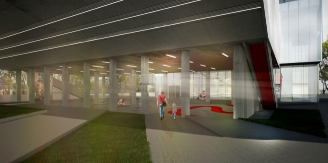The main entrance gates were placed on the facade facing the government building and divided in two parts, on for the spectators and one for the athletes. An outdoor staircase enables spectators to reach directly the tribune stage, while sportspeople are to pass through the administrative building to reach their dressing room and warming up areas through a separate interior staircase, and then reach the sports field from these areas. Thus, while this enables spectators and sportspeople to enter or exit the building at different elevations, it also avoids chaos during the entrances and exits when crowded inter-city competitions take place. Moreover, swift emergency evacuation is afforded through special emergency staircases linking directly the tribunes to the covered park. Two emergency lifts to be used in emergency cases will ensure rapid evacuation of amputee or disabled teams, sportspeople and spectators towards the park and street.