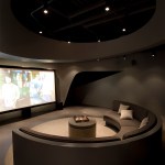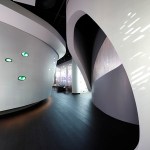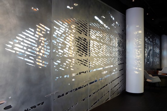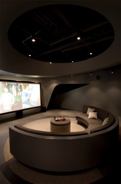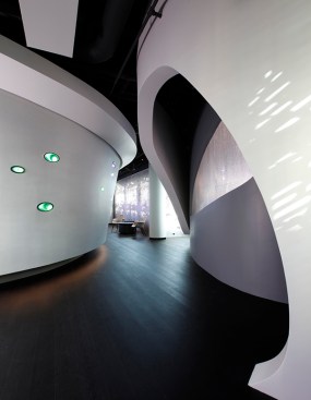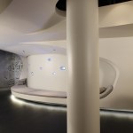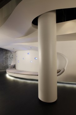 An organic, sinuous spine weaves its way through the suite. An appendaged soffit grows from the serpentine walls serving as an armature for cable trays, mechanical and electrical systems. Light portals pierce the organic forms and are equipped with programmable LED lighting. Patterns derived from the animated studies are projected onto the laser cut walls and circumscribe the interior.