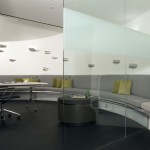 Movement is expressed throughout the space in numerous ways. For example, the lighting scheme reinforces the notion of movement. Groupings of LED lights penetrate the serpentine wall and emit color. The aluminum pieces are custom fabricated to house the LED fixtures. The housings are flush with the outside -public face of the wall and protrude into the private rooms. The fixtures add texture and create a more intimate scale to the larger context. The lighting is programmable, offering various intensities and color options. The otherwise colorless scheme is constantly in flux according to the client’s wishes. Grading rooms, edit bays, conferece rooms, open and closed offices, client areas, production spaces, entertaining areas, tape vault, mechanical rooms, machine rooms, exterior terraces and support spaces comprise the program of the facility.