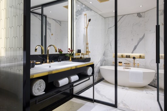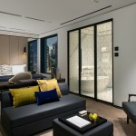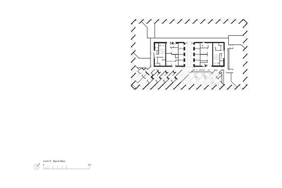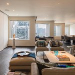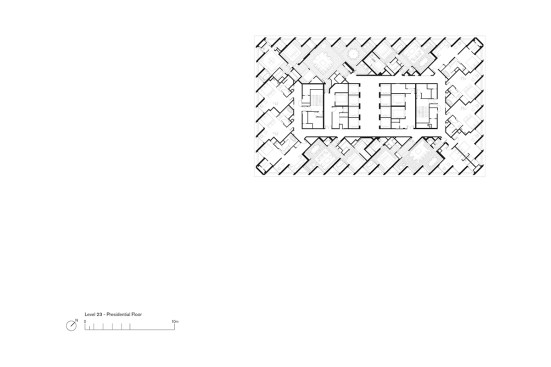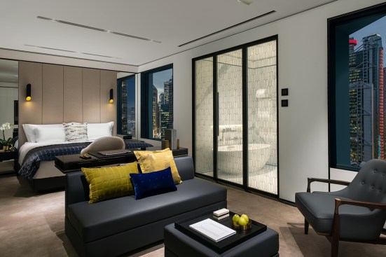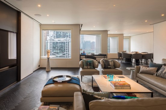 The tower is characterised by the distinctive pattern of its white façade, which is made up of a grid of square windows. In a fusion of interior and exterior, the inset bays provide a modular unit and organising principle for the hotel rooms, allowing for a variety of planning options. The upper level suites are angled to create a generous central living space. Luxurious corner suites benefit from spectacular dual- aspect views of the harbour and the peaks and gardens.