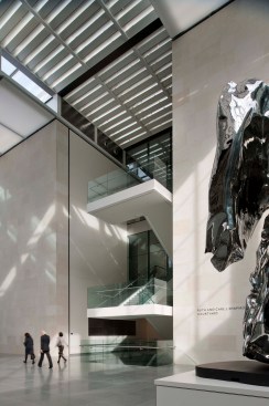 At the heart of this axis is a new information centre, from where visitors begin their tour of the galleries. A freestanding glazed structure – ‘a crystal spine’ – has been inserted between the building’s two main volumes to create the Art of the Americas Wing. Arranged over four floors, and providing fifty-three galleries this new wing has increased the museum’s exhibition space significantly, enabling some 5,000 works from the collection to be placed on permanent display. Where the crystal spine meets the central axis, it partly encloses an existing courtyard in a glass ‘jewel box’. This creates spaces for visitor orientation and a café, with a new gallery for special exhibitions beneath.