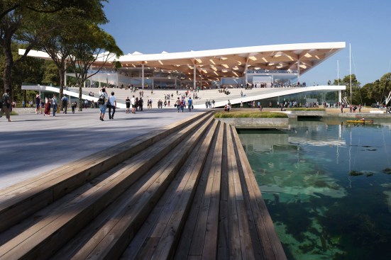 A sweeping timber-and-aluminium roof floats over the building like a canopy; it ties all the various program elements together in one elegant move, while giving the building an iconic presence along the harbour. The wavy structure is a response to the underlying functions; it rises and falls to correspond with the program below. Beyond design, the roof has four primary efficiency and sustainability attributes: shading, daylighting, ventilation, collection of rainwater and the possibility for solar cells harvest the strong Sydney sun. The roof’s triangular openings allow abundant natural light into the building, while their orientation shades the building from the harshest sun. The market has been designed to be as permeable as possible to maximise natural ventilation and minimise the need for air conditioning. The design utilises the roof’s geometry for rainwater collection and recycling.