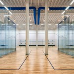 The First Floor is a 12,428 s.f. dedicated squash facility that houses four practice squash courts and two all-glass, international-competition-size squash courts. This level is connected to the four existing squash courts within the adjacent Legacy Gymnasium building.