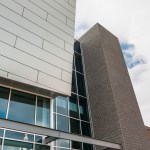 The split-rib concrete masonry unit clad elevator tower helps to transition between the existing traditional brick buildings and the new Athletic Center.