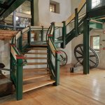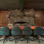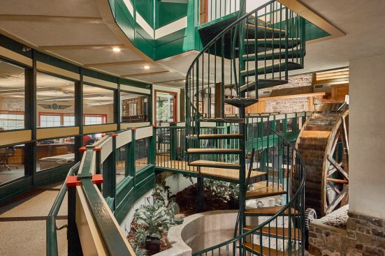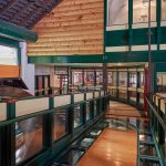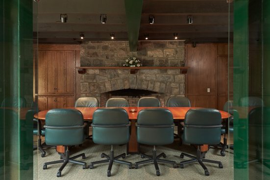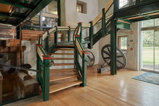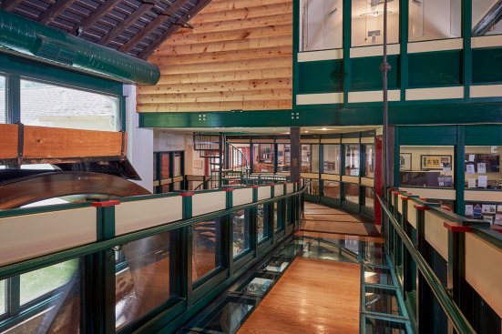 All the building’s new features were developed to achieve a complete coordination of design and a distinctive unity of place. Three ruling ideas prevail: the rugged, industrial character of the original structure; the Adirondack influences it displayed from its 1920’s use as a country club; and the geometry of the building’s reconstructed, operating water wheel. The project’s most dramatic new feature is a ramp, comprising wood, glass and steel and descending through the wheel room’s main space. The many elements are brought into harmony through careful design and a color palette that unifies the entire building.