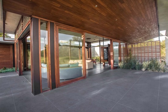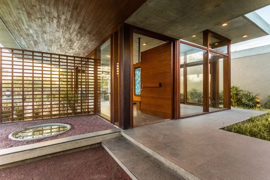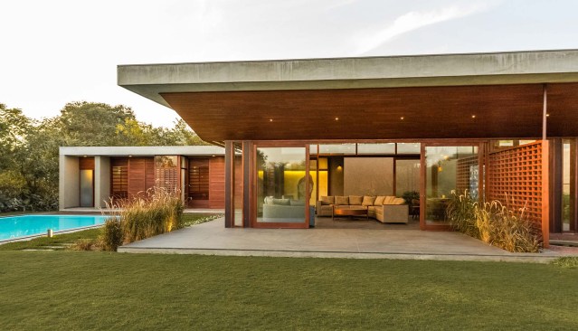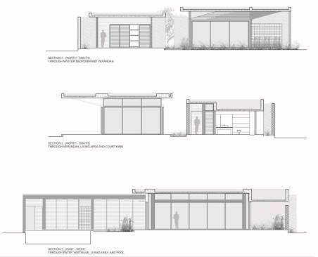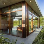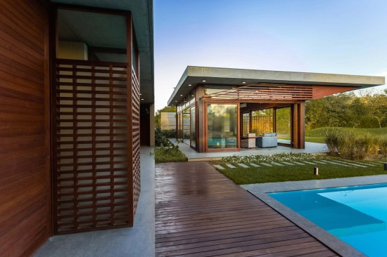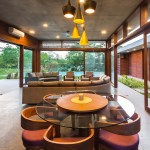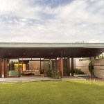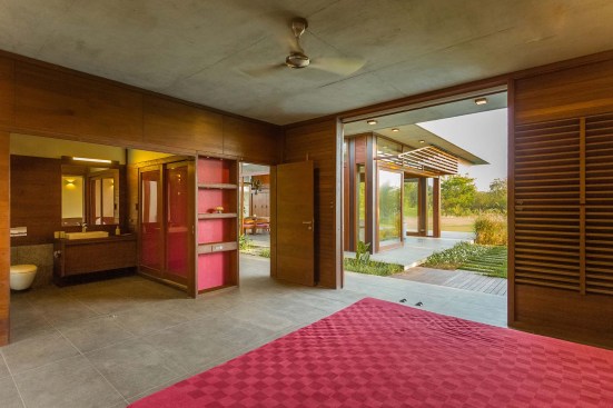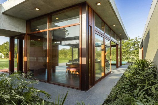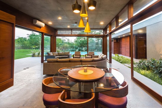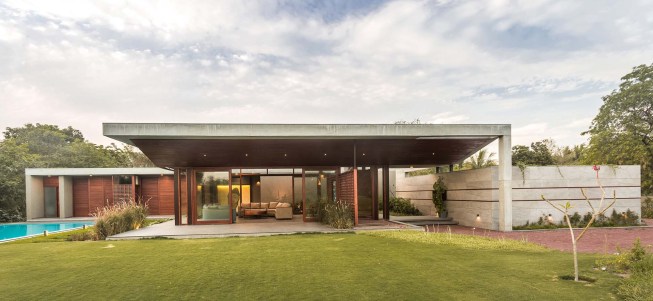 The glass pavilion is shield by the harsh sun through a deep verandah in south, an entry vestibule slab in east and through a wood screen in west.The pool located in south west part causes cool breeze to flow into the living and bedroom spaces.