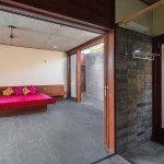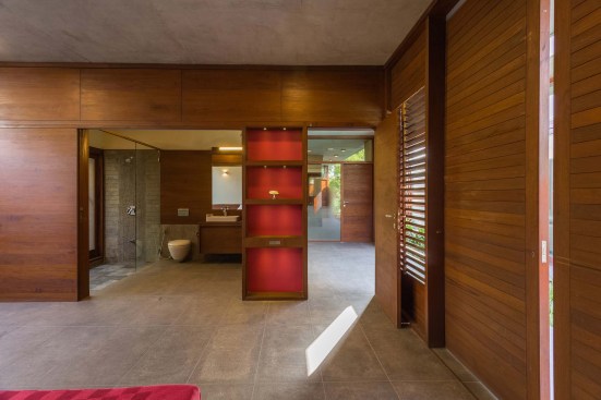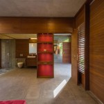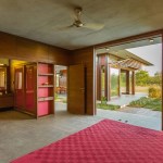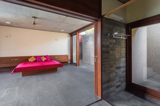 The house is intended to be informal in nature eliminating false ceiling in internal spaces and keeping exposed RCC slabs. The flooring in living and bedroom spaces is river washed Indian granite while all toilet has natural granite, slate and marble. The external walls have Indian granite cladding in certain portions and stone granule plaster. The internal walls explore direct paint without putty to have characteristic rustic look. The concern of using the waste is also explored in couple of toilets where granite waste is used to create random patterns.
