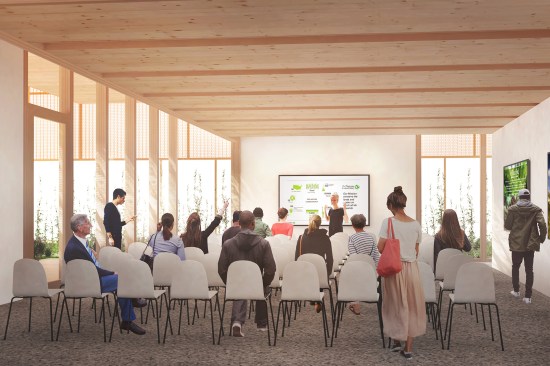 · The new one-story addition showcasing FSC-certified mass timber. The wood for the conference center originated from northern California and was fabricated into FSC-certified CLT panels and glu-lam beams and columns by DR Johnson in Riddle, Oregon.