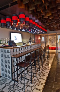 The concierge leads to two different entries, that depend on the crowd; one is for a sushi lounge with an island buffet with a metal-panelled ceiling designed for acoustics. The other entry is for the bar and dining area with cosy warm lighting that gleams from behind a stimulating false ceiling that is composed of traditional brass cylinders. The Patio, which is accessed internally, is an elaborate play of the sky view and bold, Anglo-Japanese décor and a fun blend of warm accent lighting. Taoist prayers and feng shui principles together bring the “chi”, material energy, to the design.