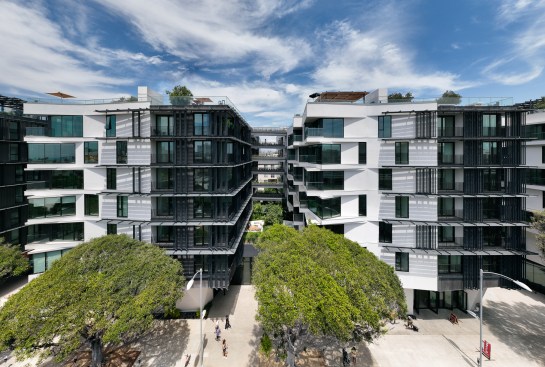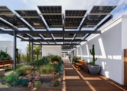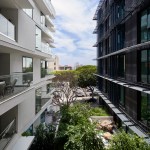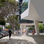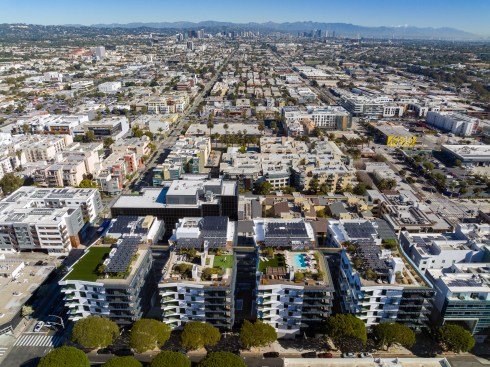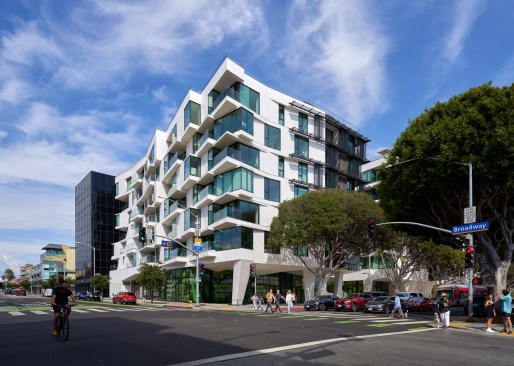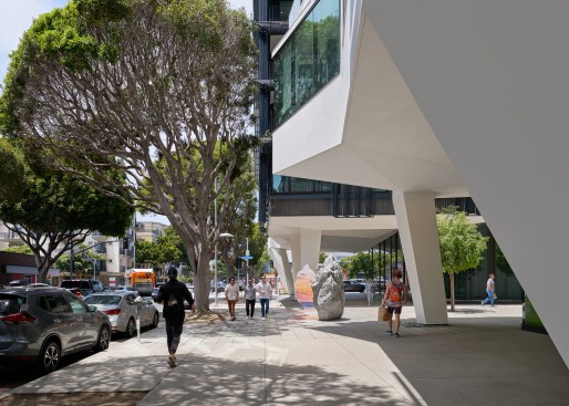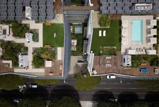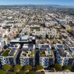 Much of Los Angeles’ multi-unit mixed-use housing is characterized by formulaic streetwall massing. The design for this 249 unit transit-oriented development rethinks the formula by breaking the street wall to offer a more sustainable, informal, and neighborly vision. The Park’s courtyards open up views for the neighbors, facilitate breezes, and expand greenery and light along the street. They also establish a strong visual and social connection between housing above and street life below. A string of public open spaces activate the connection between the light rail station and neighborhood. Faceting the building envelope extended unit views and is one of two key facade treatments used in the design. It is replaced on south facing elevations by a layered assembly that provides shade as it expands a sense of distance between buildings. A steel prefabricated moment frame conxtech reduced construction time by 3 months to cost-effectively achieve the desired modulation and flexible unit planning. The signature rooftop space offers residents a welcoming retreat with ocean views, planting, and photovoltaic shade canopies. Planting does double duty by reducing the urban heat island effect and insulating the building.