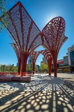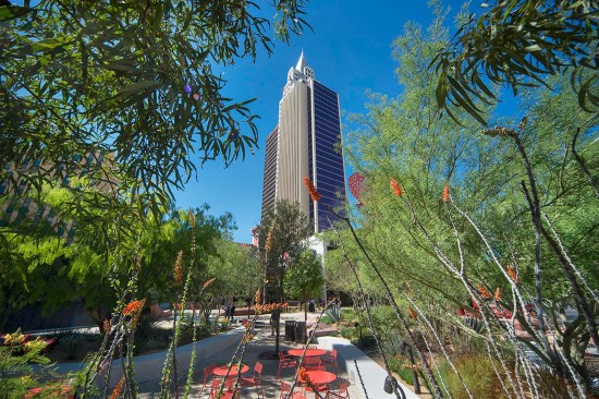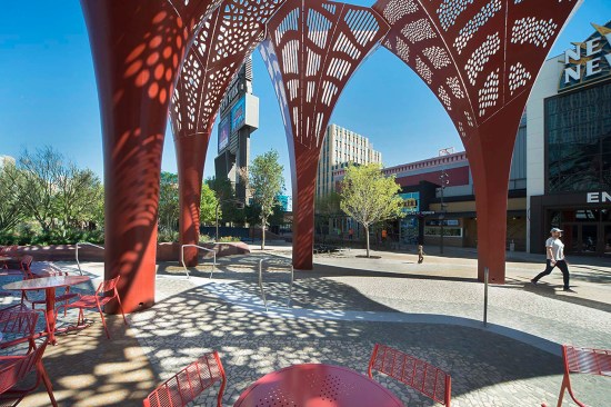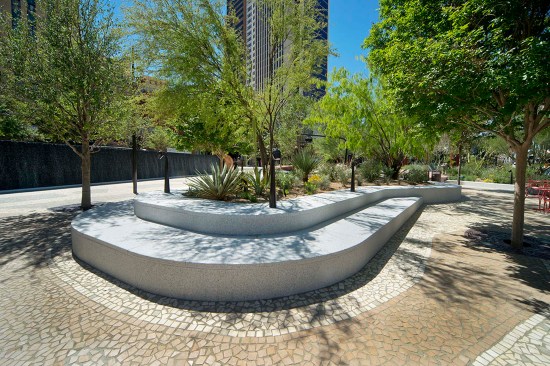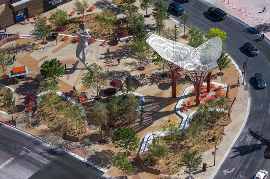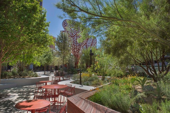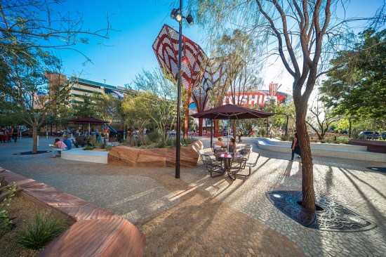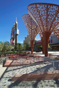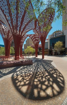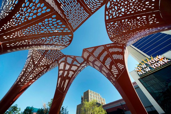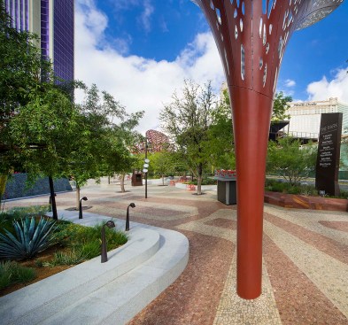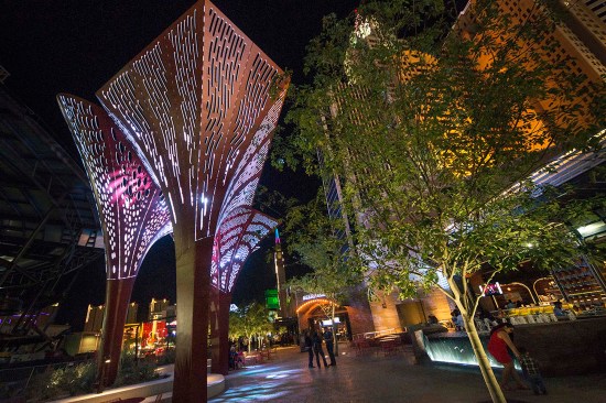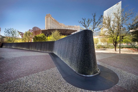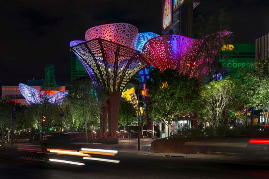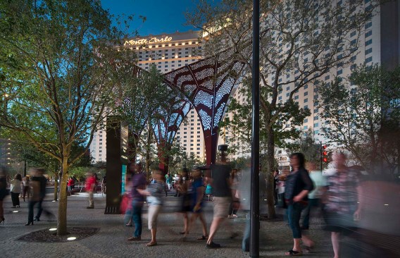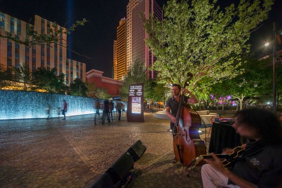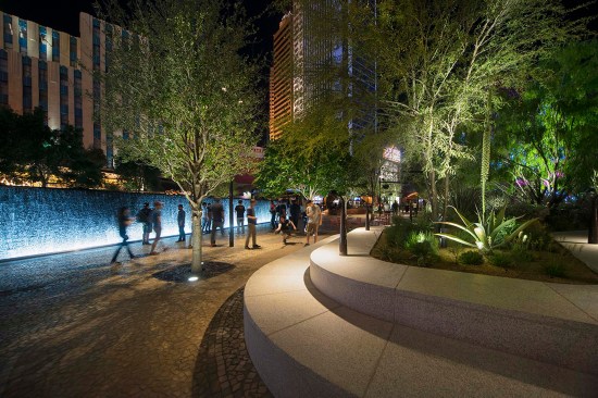 Las Vegas exists in an extremely challenging arid location, exposed to sun, heat, dust storms, and scarcity of water. All design elements mitigate these extremes to create the most enjoyable urban experience possible. Iconic shade structures, water features, and desert plantings with drought resistant trees help temper the Las Vegas heat. “The Park” utilizes “best management practice” sustainability guidelines for water use.