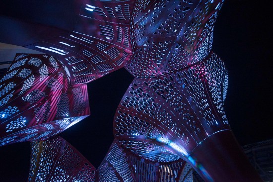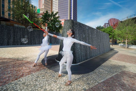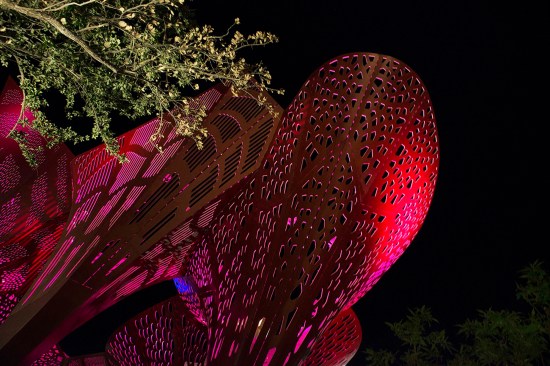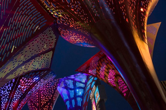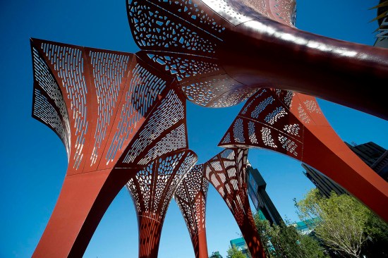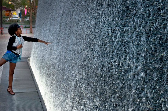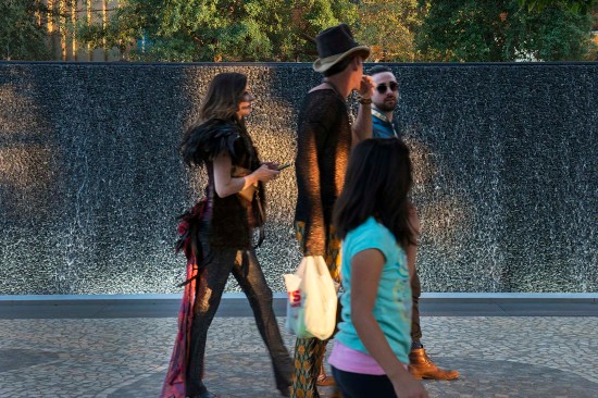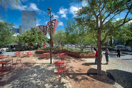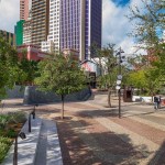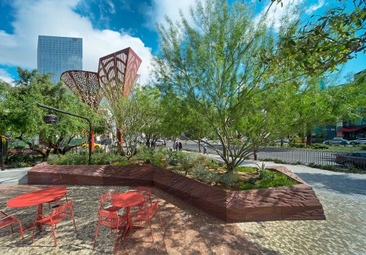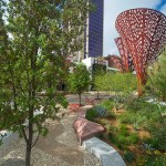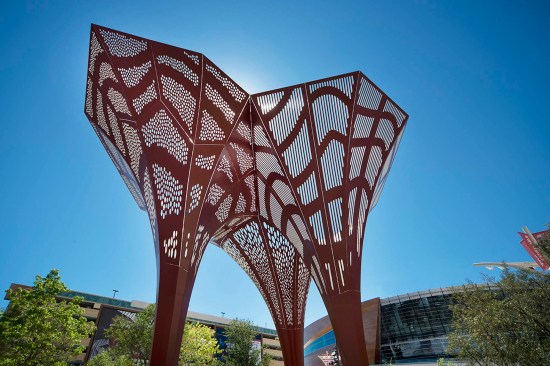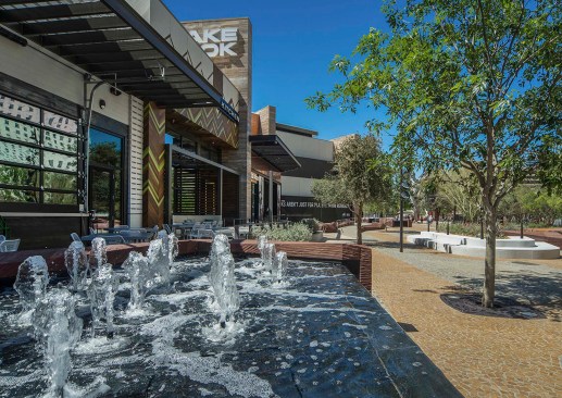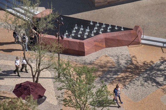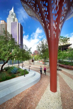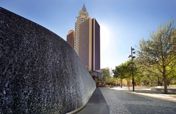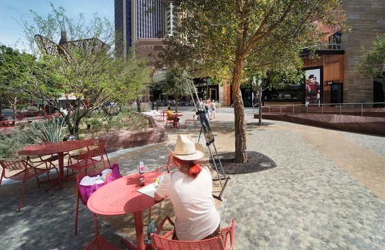 Las Vegas exists in an extremely challenging arid location, exposed to sun, heat, dust storms, and scarcity of water. All design elements mitigate these extremes to create the most enjoyable urban experience possible. Iconic shade structures, water features, and desert plantings with drought resistant trees help temper the Las Vegas heat. “The Park” utilizes “best management practice” sustainability guidelines for water use.