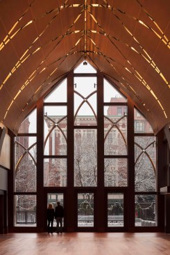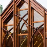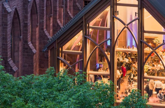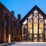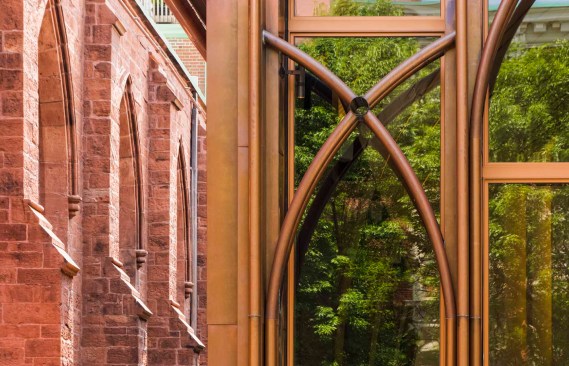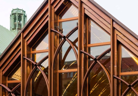 The character of the new addition is deliberately a modern version of the Gothic church – a hipper great grandchild. It is clad in copper that matches the color of the brownstone church and will patina to the color of its copper roof.
