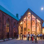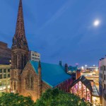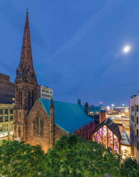 The church fronts Westminster Street that was dubbed by a blogger ‘the hippest street in the hippest ‘hood’ in the hippest city’. The historic church provides a quiet sanctuary from the street’s bustling hotels, restaurants, shops, and clubs. In contrast, the new Pavilion is transparent. Its glassy front conveys the church is open to all and an active part of the community.