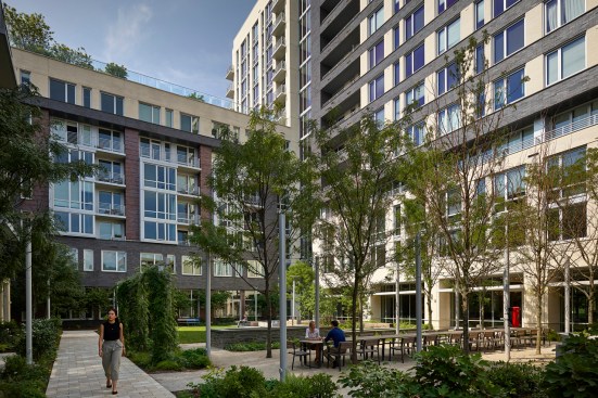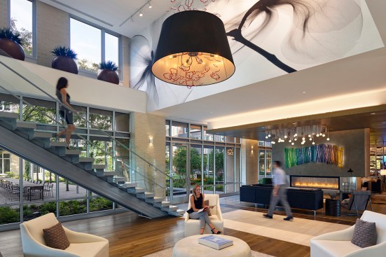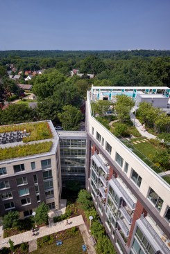 From the moment residents walk in the main entrance of the building, they are reconnected to nature with light-filled amenity spaces that all have a clear connection to the landscaped courtyard. Similarly, at elevator stops at every floor, residents are reoriented to Rock Creek Park with generous windows that bring natural light into the corridors.