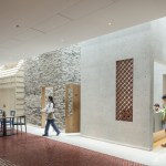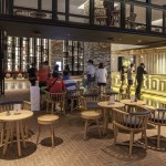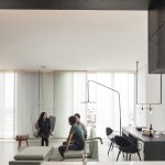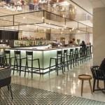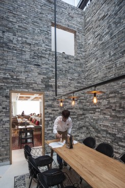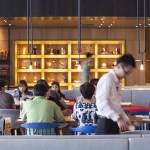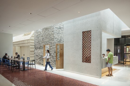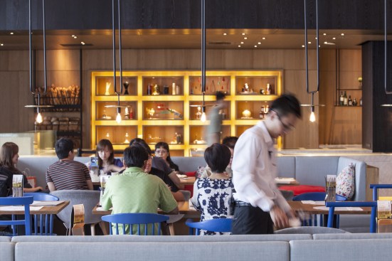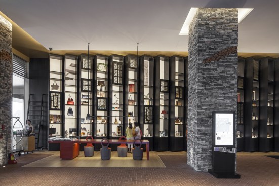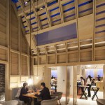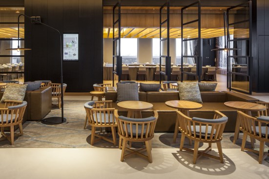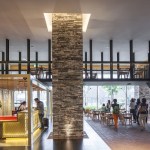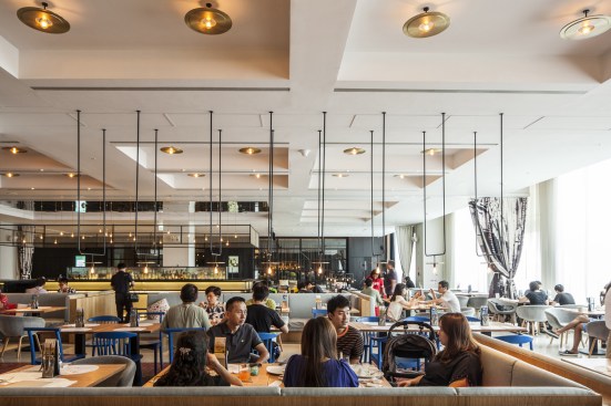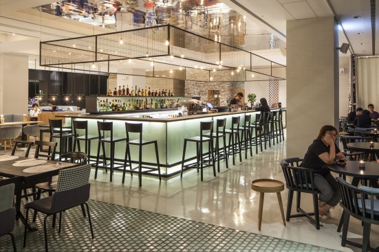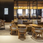 It houses an iconic bridged structure in the middle, which is clearly visible from the outside. People can walk in and out of the lobby to get a coffee or browse the shop with locally designed goods. The hotel’s sky lobby on the sixth floor includes a multi-use restaurant as well as meeting rooms. The space functions as a breakfast restaurant in the morning and a lounge bar by night.