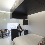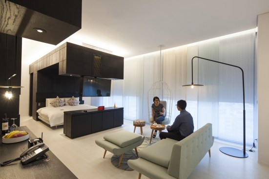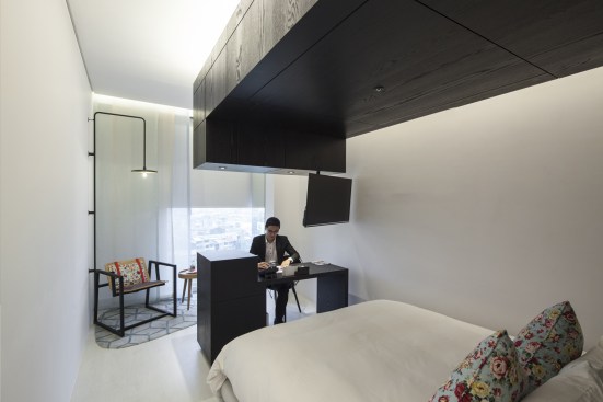 At one side of the lobby, three small characteristic houses constructed from different materials contain the reception and private meeting spaces. The 223 guest rooms are space-efficient and designed in a way to create a living area that is separate from the bedroom. Storage space, bathroom, minibar, and various multimedia facilities are arranged in one central consolidated element which is like a cabinet of curiosities that can be opened from all sides.