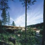 Bohlin Cywinski Jackson devised a long, linear platform that treads lightly on the land. You enter the building on its north side though a wall of weathering steel. Once inside, the lakefront is revealed through a glass wall with sliding doors and a wood deck running the length of the house. The architects tucked the building behind a thicket for privacy from people on the lake, so the view looks down the water at an angle.