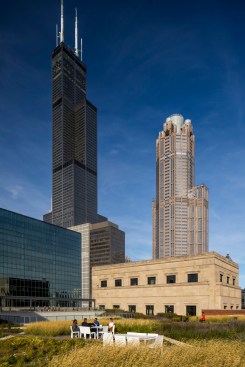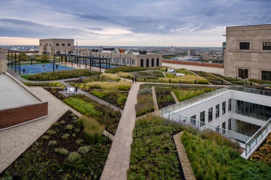 Finally, the building is topped with a 3.5-acre rooftop park, dubbed The Meadow. The outdoor experience stretches the entirety of the building and showcases a basketball court, native plantings, a bistro and bar area, and running/walking track, among other features. The Meadow provides tenants with a variety of health and wellness experiences in the midst of natural elements, creating an unparalleled greenspace experience lofted high above Ida B. Wells Drive at the gateway to Chicago.