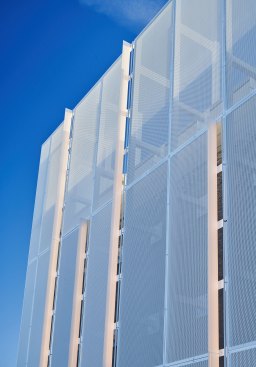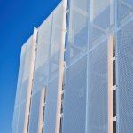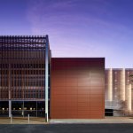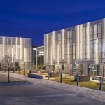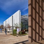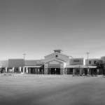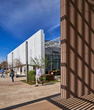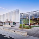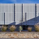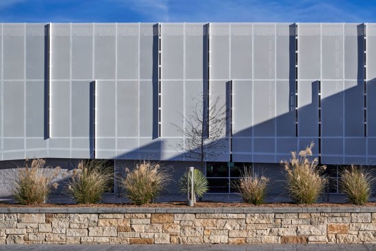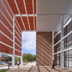 The existing concrete block walls carry a clean white perforated paneling system over its façade. The existing limestone on the center was brought down to a pedestrian level to be used as benches and other landscape features. To create a sense of place and entry, 3 tenant entries were designed to engage with façade to create a contrast between the clean white panels and the warmth of the entries.