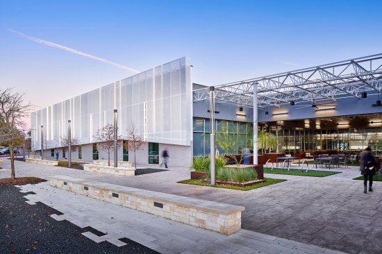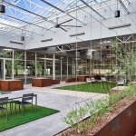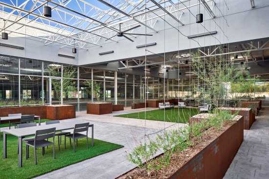 The new creative office houses a rich amenity feel throughout its design bringing its users to together. One of the main amenity features are 2 Courtyards that were carved out of the existing retail center. These Courtyards expose its existing structure to fill the space with natural light creating an oasis from its adjacent office space. Other amenities giving life to this office are a transformed oil changing station to a Fitness Center with lockers, Putting Green, Basketball Court, Dog Run, and Landscape seating and areas. The backside of the center transforms the existing loading docks into a new 2-Story Office with Mezzanine and viewing terrace and pocket park, both taking advantage to beautiful views towards the east.