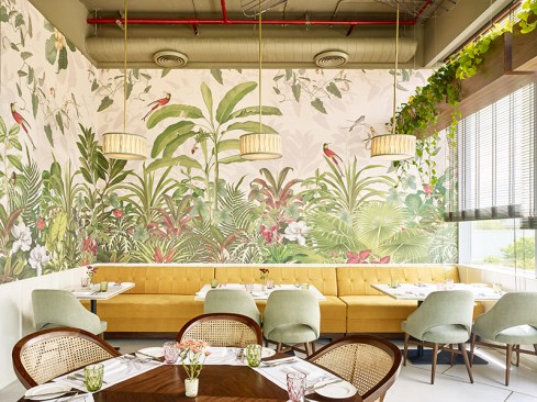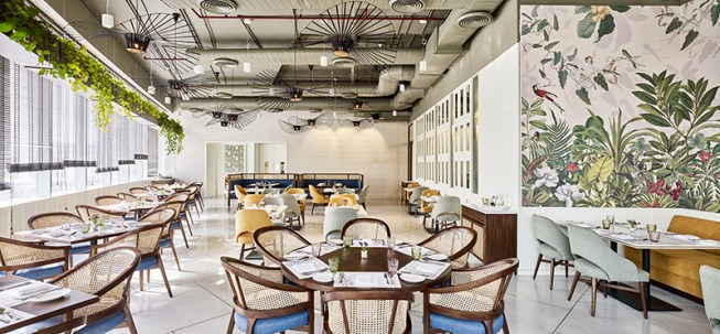 The process of choosing materials was driven by the intent of each experience. For instance, the reception creates an ‘entrance experience’ as ‘The Alley’: an art gallery that transforms every quarter with a new exhibition from the Kiran Nadar Museum of Art, one of the finest art collections in the country. While the deliberately muted shell keeps the focus on the stunning art, the layering seen in the logo, repeated as myriad graphic interpretations across the various spaces, is reflected in the nuanced construction details of its wood panelling and flooring pattern. The restaurant Coalesce, on the other hand, is a brightly-lit fresh white space infused with greenery and pop wallpaper to recreate the casual charm of a ‘sitting in your verandah’ story.
