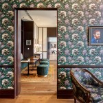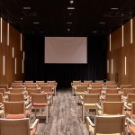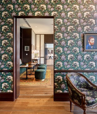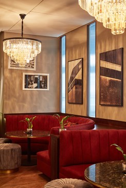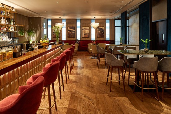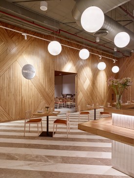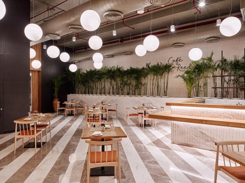 Tying together the spatial narrative is the pre-function area, which doubles up as an all-day eatery, Café Reed; a vibrant zone – with the lush backdrop of bamboo fronds beyond the café counter juxtaposed with the geometric wooden panelling screening off Oak&Cru – Café Reed provides a functional complement to the spaces surrounding it, be it as the breakfast space for gym-users, a vestibule for Oak&Cru, or a spill-out area for the Screening Room. The loose wooden furniture, diagonal grid of globe lighting, and exposed service ducts enforce the distinctly informal ambience of the space.