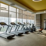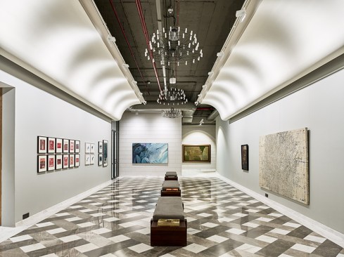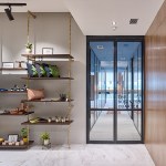 Across the gallery lies the public zone, which houses the Screening Room, the Oak&Cru Event Space, the gym and the pre-function area. The event space and the screening room are fairly similar in their visual language, with timber rafters and wooden panelling along the walls; the Screening Room can comfortably seat up to 50 people at a time. Besides the Screening Room is the Gym, which has placed along the western edge of the floor space, to ensure ample ingress of natural light through the full glazing along the peripheral wall. The gym features a markedly less dense visual vocabulary, the yellow ceiling offsetting the muted shell; the Screening Room has been conceptualized as an extension to the gym, allowing for flexibility of function and enabling use by larger groups of people as and when required.