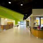 The lobby geometries reflect the geometrical shift between the ground floor and residential tower above. The ceiling negotiates the complex structural shift and conceals the building systems that penetrate down through the lobby to the below grade utilities.