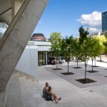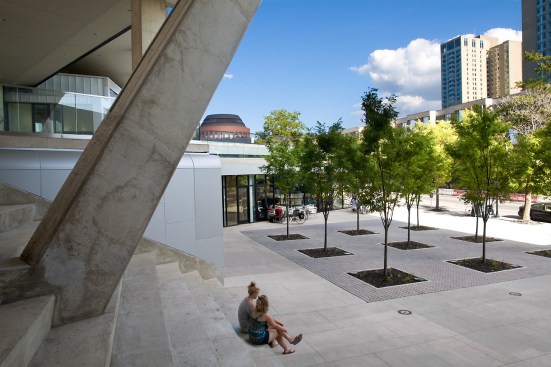 Ground level retail pushes back from the street opening a public space for informal gathering. The residential entrance exists along this axis and public activity extends up and under the residential tower via a grand stair. This open court aligns with an adjacent quad on the south side of Walnut Street connecting to Locust Walk. Outdoor dining options are provided at the upper terrace level and allow for glimpses onto the street.